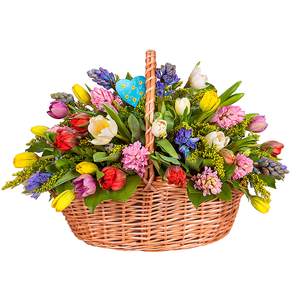 Тюльпаны микс, гиацинт, солидаго.